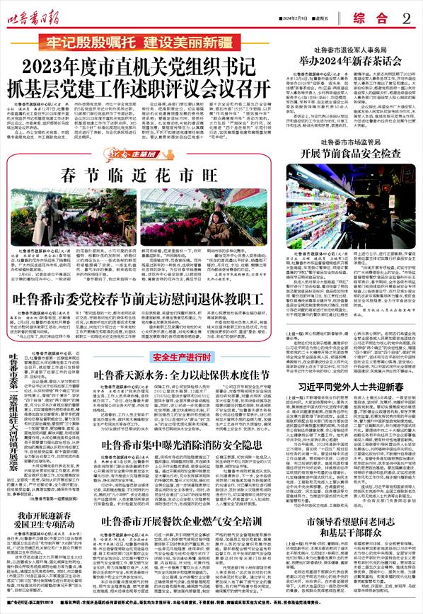 “公司召开节前安全生产专题部署会,对春节期间用水安全保供进行研究部署,对重点场所、设施加大巡查力度,发现设备设施存在隐患问题及时整改排除,快速消除不安全因素。”吐鲁番天源水务有限公司总经理曹守军表示,该公司将加大管网水质的监测力度,加强生产工艺各环节的水质管控,确保市民喝上安全水、优质水、放心水。