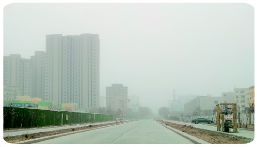 图为笼罩在沙尘中的高昌区城区街景。