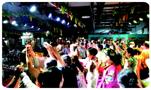 游客在麦西来甫风情庄园沉浸式体验吐鲁番民俗歌舞表演。