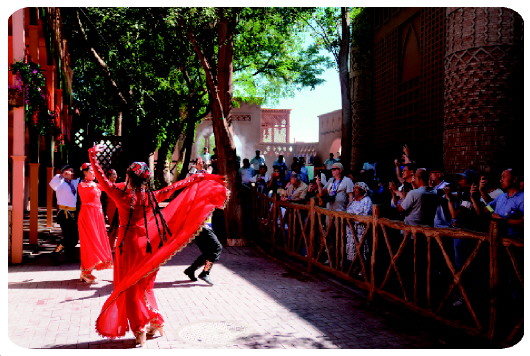 参加自治区旅游发展大会的国内外嘉宾在坎儿井民俗园观看歌舞表演。