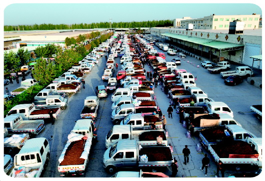 9月23日上午,吐鲁番农产品电子商务服务园区里,一辆辆装满葡萄干的车辆排成了长龙,葡萄种植户、葡萄干交易经纪人和采购商围在车旁磋商价格,一派热闹的交易场景。