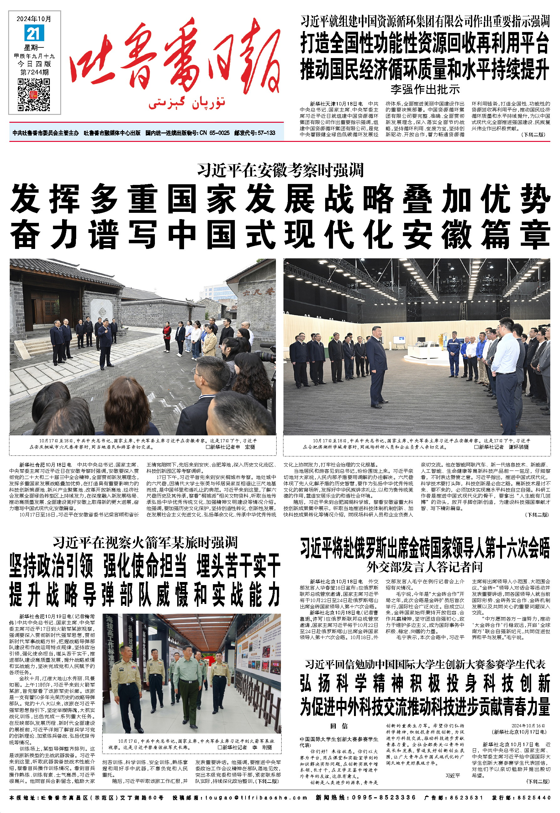 新华社合肥10月19日电(记者梅常伟)中共中央总书记、国家主席、中央军委主席习近平17日到火箭军某旅视察,强调要深入贯彻新时代强军思想,贯彻新时代军事战略方针,把握战略导弹部队建设和作战运用特点规律,坚持政治引领,强化使命担当,埋头苦干实干,推进部队建设高质量发展,提升战略威慑和实战能力,坚决完成党和人民赋予的各项任务。