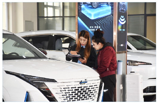 11月11日,记者在吐鲁番长安汽车4S店看到,前来看车的市民络绎不绝。在大厅的显眼位置,摆放着宣传以旧换新和置换更新补贴政策的海报和展板,销售人员正忙着向顾客介绍车辆性能及配置情况。