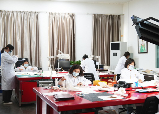 图为吐鲁番学研究院技术保护研究所内文物修复工作者正在进行文物修复工作。