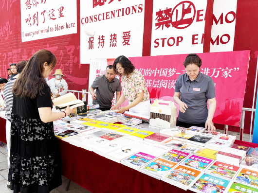 舞台对面,“书香巴扎”同步亮相,县图书馆与新华书店精选200余册图书,设置“红色经典”“乡村振兴”等四大主题展区,工作人员现场发放《全民阅读倡议书》,并为群众办理电子借阅证,让书香触手可及。