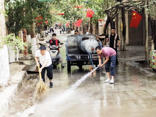 清晨八点半,志愿者的身影已活跃在街巷中。他们手持高压水枪、扫帚等工具对桑葚落果形成的斑渍、散落的果皮纸屑等垃圾进行深度清洁,确保街巷干净整洁。“巷道比平时更干净了。”居民阿地力·玉山点赞道。