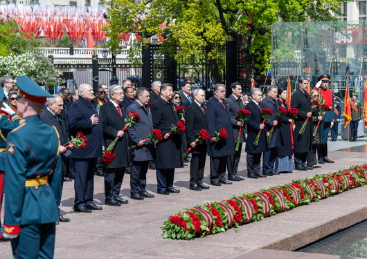 庆典结束后,习近平同其他国家领导人一起从红场来到亚历山大花园,向无名烈士墓献花,并肃立默哀。随后,各国领导人集体合影留念。