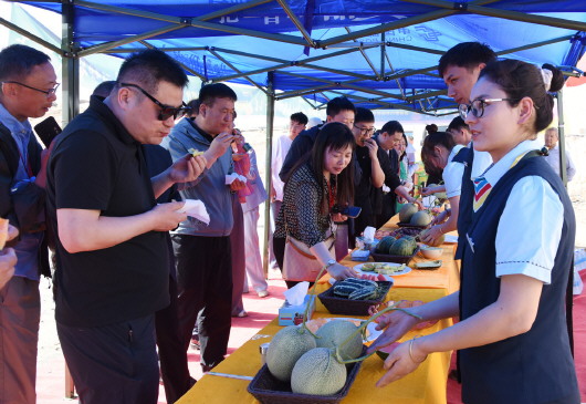▲与会代表在高昌区三堡乡哈密瓜种植基地品尝特色水果。