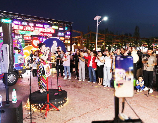 随着歌声持续飘荡,人群中,头发花白的老人、稚气未脱的孩童都随着节奏摇摆,掌声、笑声与美食的香气一同在夜空中飘荡。甘肃游客赵涛山高举手机记录精彩瞬间,连声赞叹:“新疆真是歌舞的海洋!连夜市里都藏着这么多‘金嗓子’,吃着美食听着歌,太赞了!”