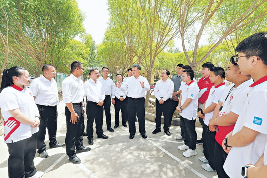 五月二十七日,自治区党委书记马兴瑞在克孜勒苏柯尔克孜自治州调研。这是马兴瑞来到阿图什市哈拉峻乡谢依特小学,亲切看望戍边支教西部计划志愿者服务队队员,同大家热情交流,关切询问工作生活情况。□石榴云/新疆日报记者 崔志坚摄