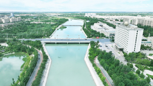 白杨河穿城而过,河岸两旁绿树成荫,一幅大自然绘制的生态画卷跃然眼前。(航拍)