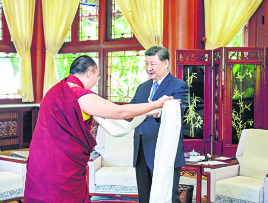6月6日,中共中央总书记、国家主席、中央军委主席习近平在北京中南海接受班禅额尔德尼·确吉杰布拜见。这是班禅向习近平敬献哈达。 □新华社记者谢环驰摄