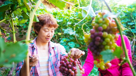 走进董双双农业合作社的温室大棚,只见串串葡萄如珍珠般点缀枝头,散发着诱人的香甜气息,工人们正拿着剪刀,小心地采摘装箱。合作社负责人董月强高兴地说:“‘牛奶葡萄’在市场上十分抢手,常常还未成熟就被客商订购一空。”