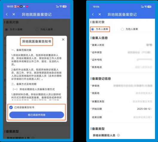 (三)仔细阅读异地就医备案告知书,点击【已阅读备案告知书】→【我已阅读并同意】