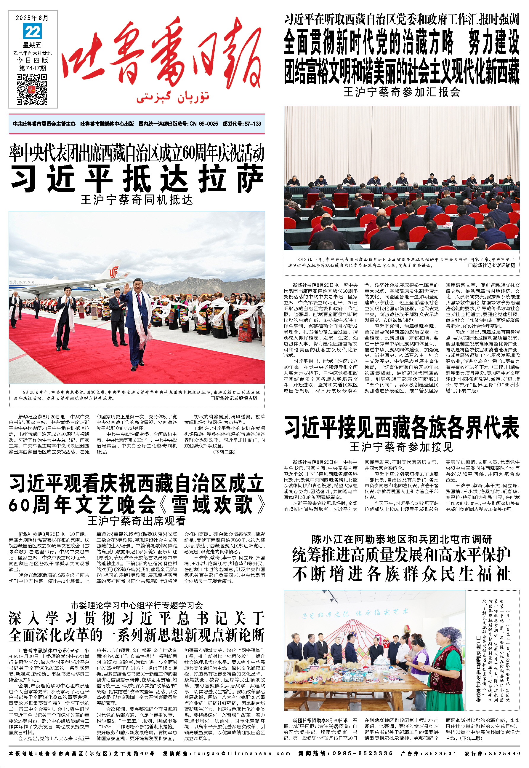 新华社拉萨8月20日电 率中央代表团出席西藏自治区成立60周年庆祝活动的中共中央总书记、国家主席、中央军委主席习近平,20日听取西藏自治区党委和政府工作汇报。他强调,西藏要全面贯彻新时代党的治藏方略,坚持稳中求进工作总基调,完整准确全面贯彻新发展理念,扎实推动高质量发展,持续深入抓好稳定、发展、生态、强边四件大事,努力建设团结富裕文明和谐美丽的社会主义现代化新西藏。