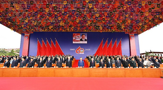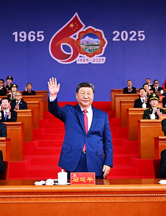 新华社拉萨8月21日电 六十载奋斗栉风沐雨,六十年雪域沧桑巨变。21日上午,西藏各族各界干部群众约2万人欢聚拉萨市布达拉宫广场,热烈庆祝西藏自治区成立60周年。中共中央总书记、国家主席、中央军委主席习近平出席庆祝大会。 中共中央政治局常委、全国政协主席、中央代表团团长王沪宁出席并讲话,中共中央政治局常委、中央办公厅主任蔡奇出席。 古城拉萨彩旗飘扬,处处洋溢着节日的氛围。雄伟的布达拉宫下,搭建起藏式风格的大会主席台。主席台上方中华人民共和国国徽和“西藏自治区成立60周年庆祝大会”横幅十分醒目,背景墙上悬挂着大庆会徽和“1965”“2025”字样,10面红旗分列两侧。主席台对面的布达拉宫广场上,身着节日盛装的各族群众从四面八方汇聚到这里,手中挥动着红旗,汇聚成一片欢乐的海洋。 上午10时许,在欢快的乐曲声中,习近平等领导同志走上主席台,全场响起长时间的热烈掌声。 西藏自治区党委副书记、自治区人民政府主席嘎玛泽登宣布大会开始。全场起立,高唱国歌,鲜艳的五星红旗在布达拉宫广场冉冉升起。 中共中央政治局委员、国务院副总理、中央代表团副团长张国清宣读中共中央、全国人大常委会、国务院、全国政协、中央军委关于庆祝西藏自治区成立60周年的贺电。 王沪宁向西藏自治区赠送习近平题词的“共建中华民族共同体 书写美丽西藏新篇章”贺匾。 王沪宁发表讲话。他说,1965年9月,在党中央亲切关怀和党的民族政策光辉照耀下,西藏自治区宣告成立。这是西藏发展史上具有划时代意义的大事,巩固了西藏和平解放和民主改革的伟大成果,实现了西藏社会制度的历史性跨越。60年来,西藏经济社会全面发展,民族区域自治制度成功实践,民族团结日益巩固,各族人民生活蒸蒸日上,充分展现了中国共产党领导的坚强力量,充分展现了我国社会主义制度的显著政治优势。 王沪宁表示,党的十八大以来,以习近平同志为核心的党中央高度重视、全面加强西藏工作,确立新时代党的治藏方略,