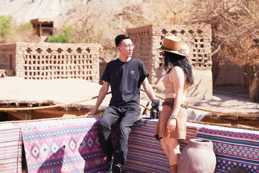 王玉玺(左一)与游客沟通拍摄细节。吐鲁番市融媒体中心记者 刘字昂 摄