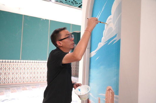 高扬在墙面上绘画。 吐鲁番市融媒体中心记者 买迪努尔 摄