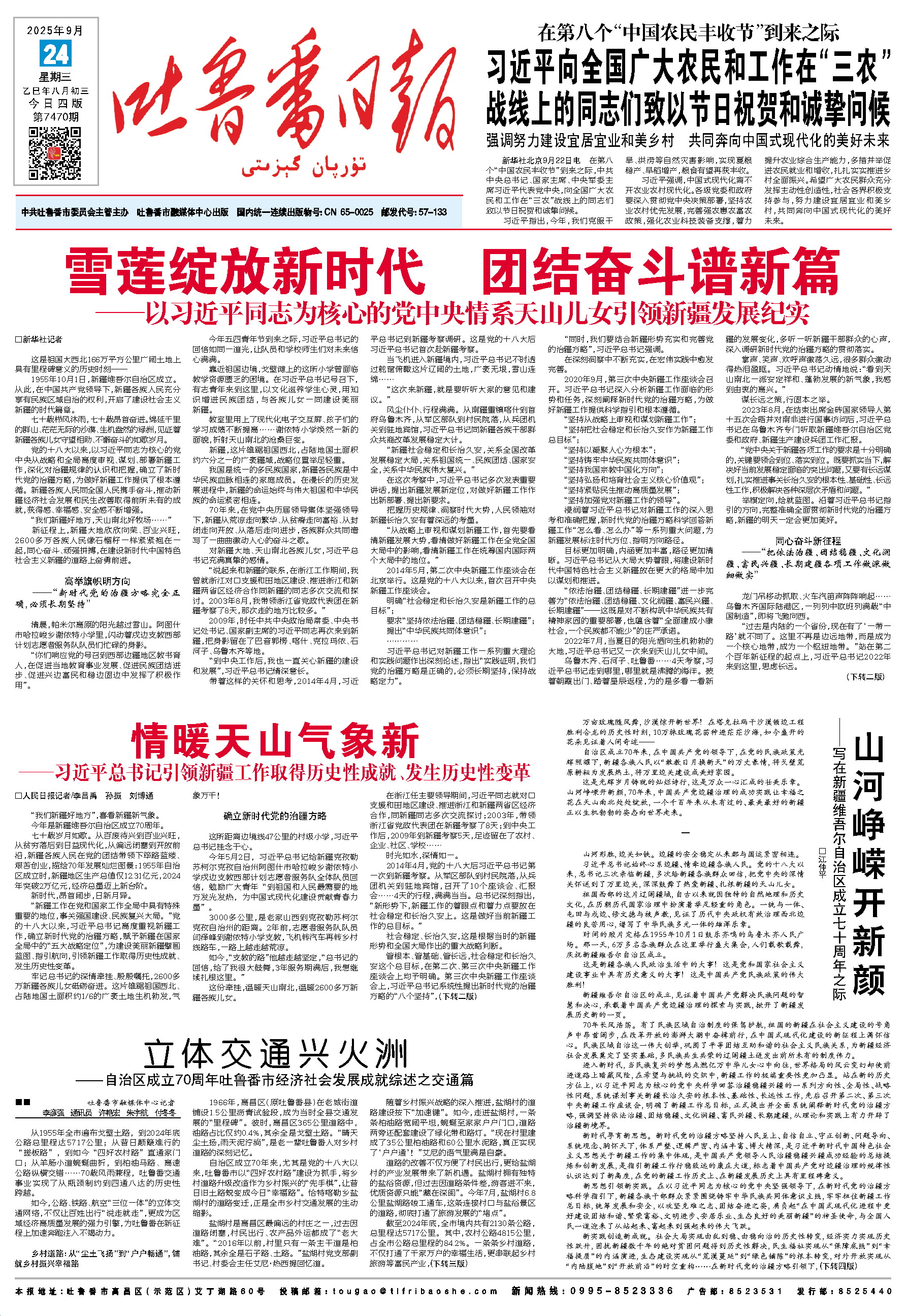 自治区成立70年来,在中国共产党的领导下,在党的民族政策光辉照耀下,新疆各族人民以“敢教日月换新天”的万丈豪情,将戈壁荒原耕耘为发展热土,将万里边关建设成美好家园。