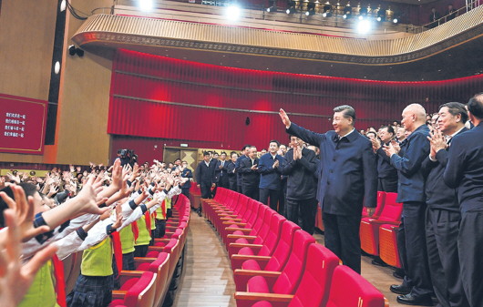 王沪宁、蔡奇、李干杰、何立峰、王小洪、雪克来提·扎克尔、谌贻琴、王东峰和刘振立,在新疆工作过的老同志,以及中央和国家机关有关部门负责同志、中央代表团全体成员一同观看演出。