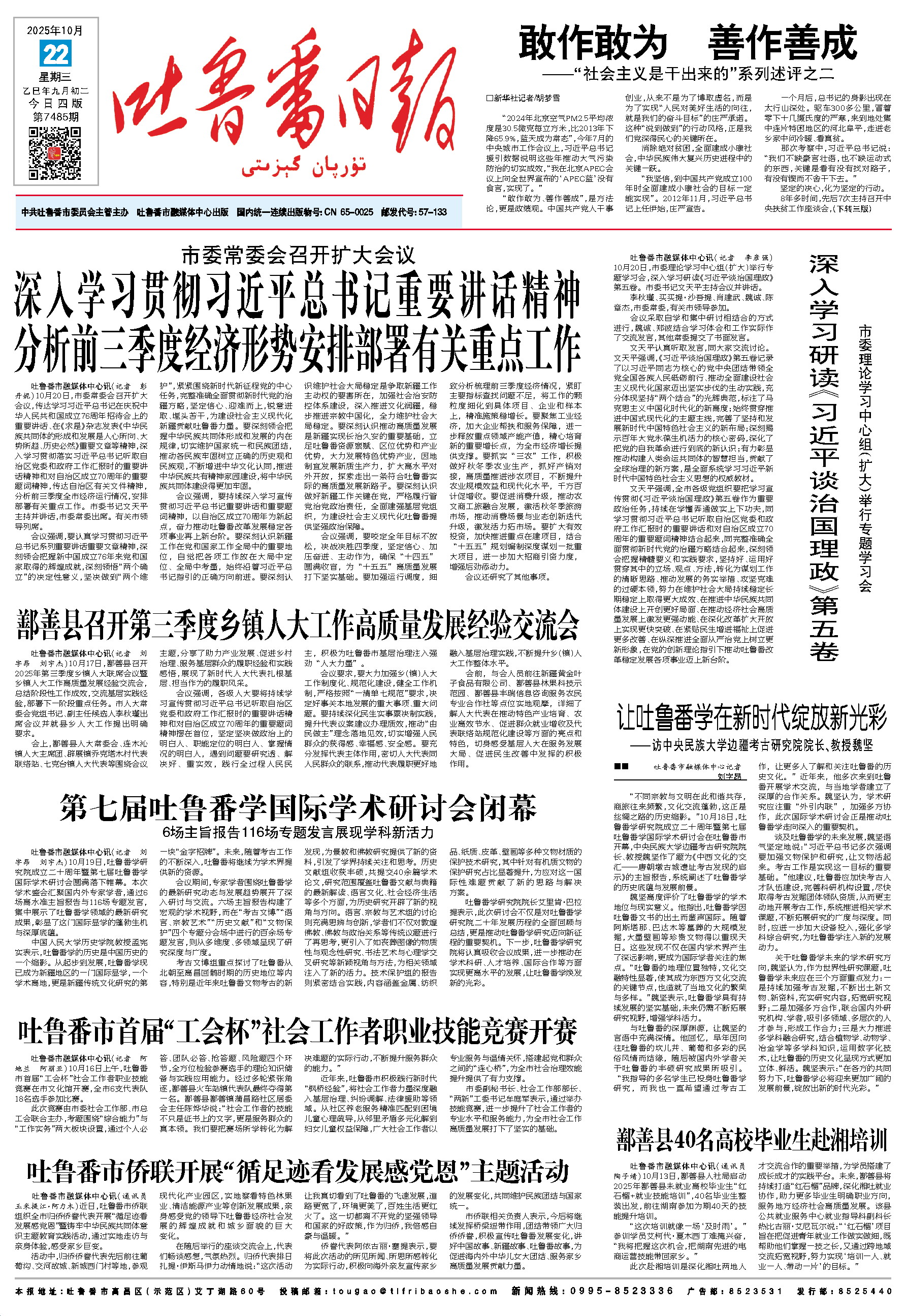 文天平强调,全市各级党组织要把学习宣传贯彻《习近平谈治国理政》第五卷作为重要政治任务,持续在学懂弄通做实上下功夫,同学习贯彻习近平总书记听取自治区党委和政府工作汇报时的重要讲话和对自治区成立70周年的重要题词精神结合起来,同完整准确全面贯彻新时代党的治疆方略结合起来,深刻领会把握精髓要义和实践要求,坚持好、运用好贯穿其中的立场、观点、方法,转化为谋划工作的清晰思路、推动发展的务实举措、攻坚克难的过硬本领,努力在维护社会大局持续稳定长期稳定上取得更大成效、在推进中华民族共同体建设上开创更好局面、在推动经济社会高质量发展上激发更强动能、在深化改革扩大开放上实现更快突破、在紧贴民生增进福祉上促进更多改善、在纵深推进全面从严治党上树立更新形象,在党的创新理论指引下推动吐鲁番改革稳定发展各项事业迈上新台阶。