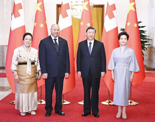 11月25日上午,国家主席习近平在北京人民大会堂会见来华进行国事访问的汤加国王图普六世。这是习近平和夫人彭丽媛同图普六世和王后娜娜茜帕乌合影。 □新华社记者燕雁摄