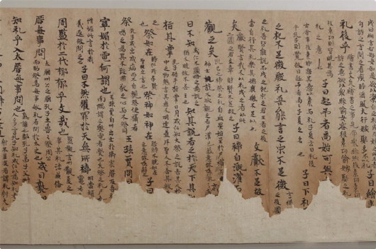 1969年,出土于吐鲁番阿斯塔那363号墓葬的唐景龙四年写本《论语》郑注,亦即享有盛名的卜天寿写本。该写本是作为死者的书籍随葬,内容相对完整,涵盖《论语》正文以及相应注释。写本残卷长538厘米,共178行,每行20字左右,存《为政》“何为则民服”章以下15行及《八佾》《里仁》《公冶长》3篇。