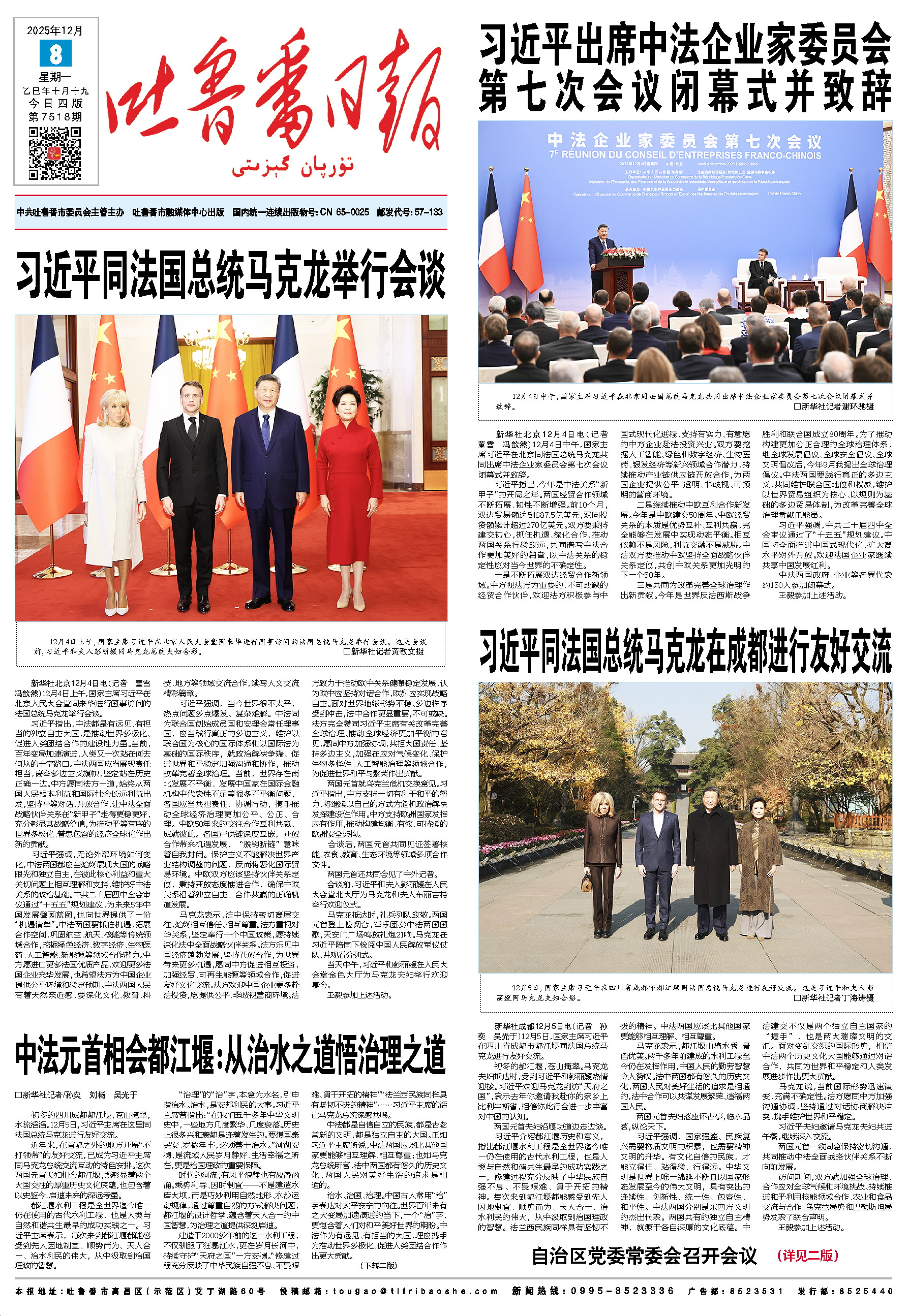 新华社北京12月4日电(记者 董雪冯歆然)12月4日上午,国家主席习近平在北京人民大会堂同来华进行国事访问的法国总统马克龙举行会谈。 习近平指出,中法都是有远见、有担当的独立自主大国,是推动世界多极化、促进人类团结合作的建设性力量。当前,百年变局加速演进,人类又一次站在何去何从的十字路口。中法两国应当展现责任担当,高举多边主义旗帜,坚定站在历史正确一边。中方愿同法方一道,始终从两国人民根本利益和国际社会长远利益出发,坚持平等对话、开放合作,让中法全面战略伙伴关系在“新甲子”走得更稳更好,充分彰显其战略价值,为推动平等有序的世界多极化、普惠包容的经济全球化作出新的贡献。 习近平强调,无论外部环境如何变化,中法两国都应当始终展现大国的战略眼光和独立自主,在彼此核心利益和重大关切问题上相互理解和支持,维护好中法关系的政治基础。中共二十届四中全会审议通过“十五五”规划建议,为未来5年中国发展擘画蓝图,也向世界提供了一份“机遇清单”。中法两国要抓住机遇,拓展合作空间,巩固航空、航天、核能等传统领域合作,挖掘绿色经济、数字经济、生物医药、人工智能、新能源等领域合作潜力。中方愿进口更多法国优质产品,欢迎更多法国企业来华发展,也希望法方为中国企业提供公平环境和稳定预期。中法两国人民有着天然亲近感,要深化文化、教育、科技、地方等领域交流合作,续写人文交流精彩篇章。 习近平强调,当今世界很不太平,热点问题多点爆发、复杂难解。中法同为联合国创始成员国和安理会常任理事国,应当践行真正的多边主义,维护以联合国为核心的国际体系和以国际法为基础的国际秩序,就政治解决争端、促进世界和平稳定加强沟通和协作,推动改革完善全球治理。当前,世界存在南北发展不平衡、发展中国家在国际金融机构中代表性不足等很多不平衡问题,各国应当共担责任、协调行动,携手推动全球经济治理更加公平、公正、合理。中欧50年来的交往合作互利共赢、成就彼此。各国产供链深度互嵌,开放合作带来机遇发展,“脱钩断链”意味着自我封闭。保护主义不能解决世界产业结构调整的问题,反而将恶化国际贸易环境。中欧双方应该坚持伙伴关系定位,秉持开放态度推进合作,确保中欧关系沿着独立自主、合作共赢的正确轨道发展。 马克龙表示,法中保持密切高层交往,始终相互信任、相互尊重。法方重视对华关系,坚定奉行一个中国政策,愿持续深化法中全面战略伙伴关系。法方乐见中国经济蓬勃发展,坚持开放合作,为世界带来更多机遇,愿同中方促进相互投资,加强经贸、可再生能源等领域合作,促进友好文化交流。法方欢迎中国企业更多赴法投资,愿提供公平、非歧视营商环境。法方致力于推动欧中关系健康稳定发展,认为欧中应坚持对话合作,欧洲应实现战略自主。面对世界地缘形势不稳、多边秩序受到冲击,法中合作更显重要,不可或缺。法方完全赞同习近平主席有关改革完善全球治理、推动全球经济更加平衡的意见,愿同中方加强协调,共担大国责任、坚持多边主义,加强在应对气候变化、保护生物多样性、人工智能治理等领域合作,为促进世界和平与繁荣作出贡献。 两国元首就乌克兰危机交换意见。习近平指出,中方支持一切有利于和平的努力,将继续以自己的方式为危机政治解决发挥建设性作用。中方支持欧洲国家发挥应有作用,推动构建均衡、有效、可持续的欧洲安全架构。 会谈后,两国元首共同见证签署核能、农食、教育、生态环境等领域多项合作文件。 两国元首还共同会见了中外记者。 会谈前,习近平和夫人彭丽媛在人民大会堂北大厅为马克龙和夫人布丽吉特举行欢迎仪式。 马克龙抵达时,礼兵列队致敬。两国元首登上检阅台,军乐团奏中法两国国歌,天安门广场鸣放礼炮21响。马克龙在习近平陪同下检阅中国人民解放军仪仗队,并观看分列式。 当天中午,习近平和彭丽媛在人民大会堂金色大厅为马克龙夫妇举行欢迎宴会。 王毅参加上述活动。