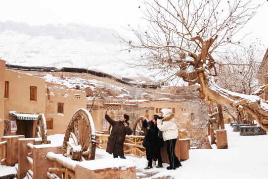 图2 :游客在落雪后的吐峪沟景区游玩。 吐鲁番市融媒体中心记者 刘健摄