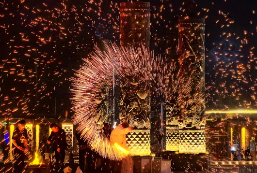 夜幕中,表演者挥动特制花棒,将千余度高温的铁水奋力击打向空中。瞬间,铁水化作万千璀璨金点,如星河倾泻,似天女散花,在墨色天幕上绽放出“火树银花”的绚丽景象。现场观众惊叹连连,纷纷举起手机,记录下这震撼夺目的瞬间。
