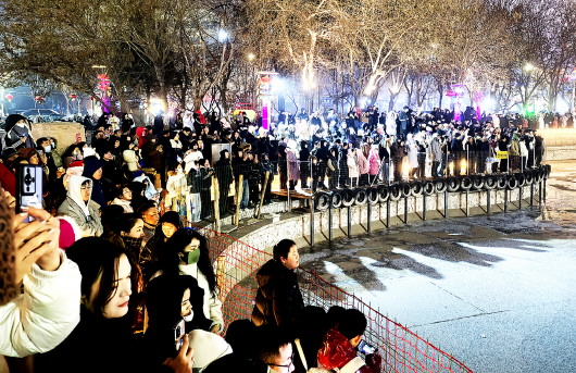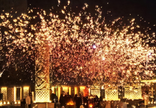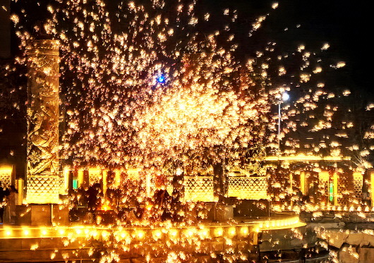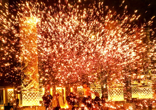 ▲闪烁的铁花倾泻而下,仿佛绚烂的烟花雨,让人叹为观止。1月10日晚,非遗打铁花在吐鲁番市高昌区文化路人工湖精彩上演,吸引了众多市民和游客观看,呈现了一场视觉与文化的双重盛宴,点亮了吐鲁番冬日的夜空。 本版图片均由吐鲁番市融媒体中心记者 刘健摄