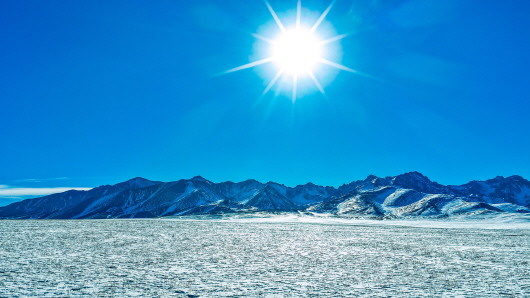 ▲木孜洛克山在冬日晴朗天气下,展现出一幅雪山、草原与蓝天交相辉映的自然画卷。