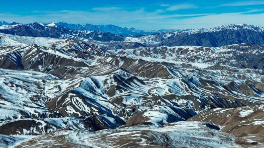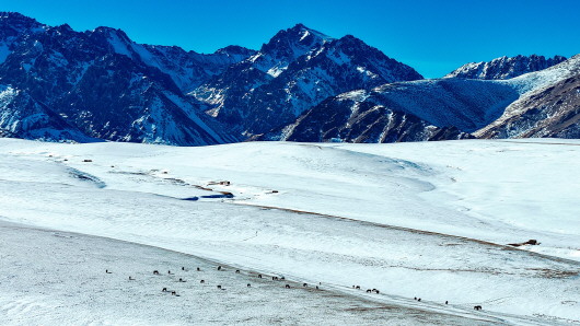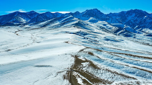 1月14日,冬日晴朗,托克逊县的木孜洛克山宛如一幅自然画卷,雪山、草原与蓝天交相辉映。