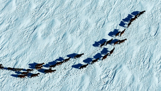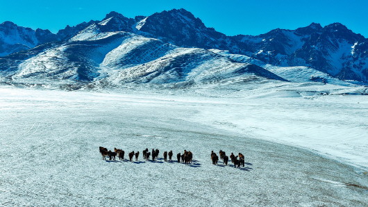 ▲雪原上,马群悠闲地踱步,似在聆听雪花飘落的轻柔絮语。