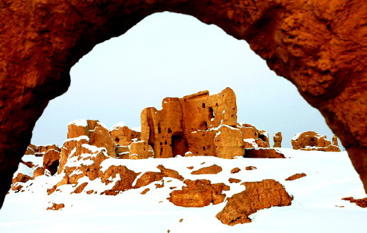 雪落交河故城,像披上了神秘的面纱,远远望去,故城显得更加肃穆。