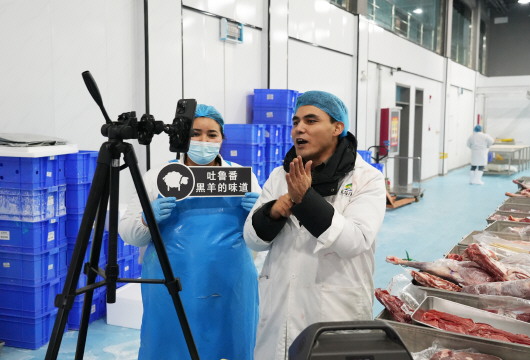 网络主播通过直播销售吐鲁番黑羊肉。