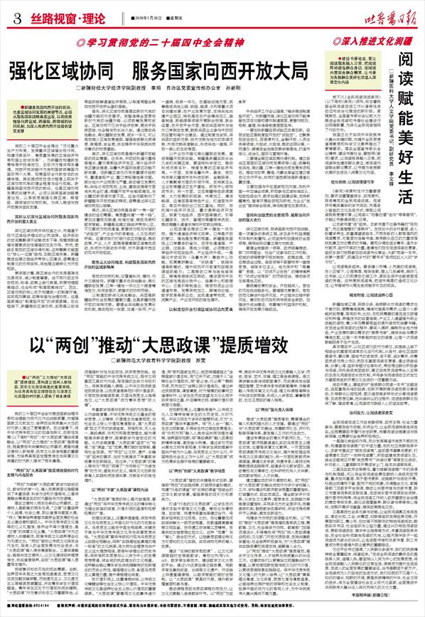 党的二十届四中全会提出“优化重大生产力布局,发挥重点区域增长极作用,构建优势互补、高质量发展的区域经济布局和国土空间体系”,为新疆在构建新发展格局中找准定位、主动作为提供根本遵循。向西开放战略作为党和国家统筹国内国际两个大局、拓展国际合作新空间的关键举措,其实施成效在很大程度上取决于区域协同机制的健全程度与运行效能。新疆是我国向西开放的前沿,也是区域协同发展的关键节点,必须从服务国家战略高度出发,以系统思维强化跨区域、跨层级、跨领域的协同机制,为深入推进向西开放提供坚实支撑。