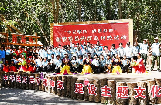 甜蜜葡萄沟群众村晚精彩上演。图为游客与演员在葡萄沟景区演出现场合影。 吐鲁番市融媒体中心记者 刘健 摄