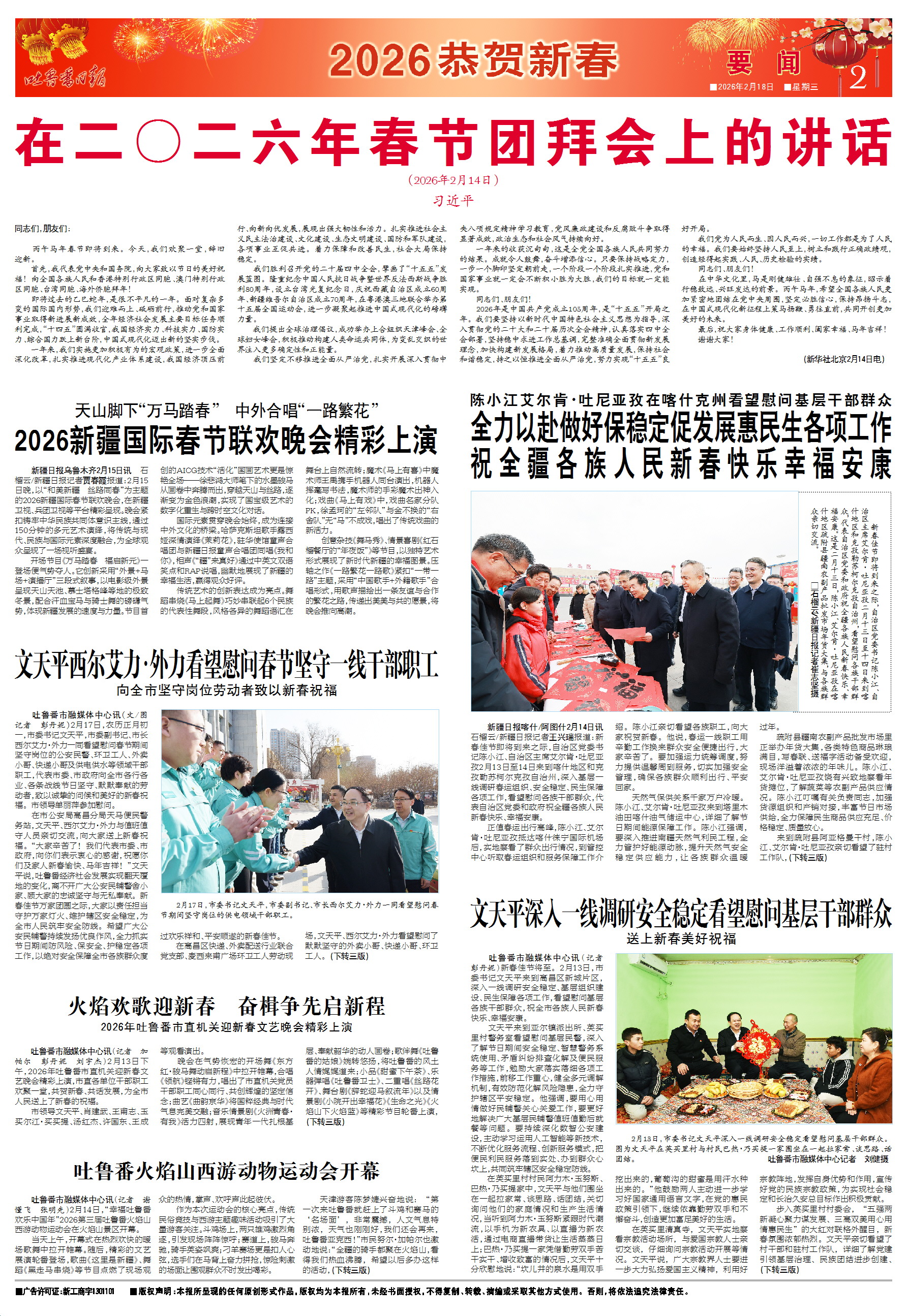 新疆日报乌鲁木齐2月15日讯 石榴云/新疆日报记者贾春霞报道:2月15日晚,以“和美新疆 丝路同春”为主题的2026新疆国际春节联欢晚会,在新疆卫视、兵团卫视等平台精彩呈现。晚会紧扣铸牢中华民族共同体意识主线,通过150分钟的多元艺术演绎,将传统与现代、民族与国际元素深度融合,为全球观众呈现了一场视听盛宴。