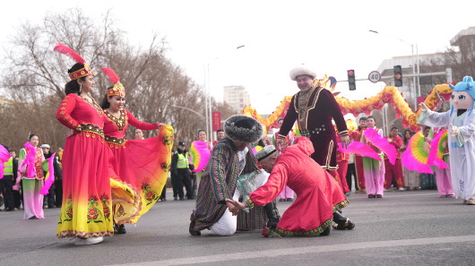 巡游所至,街道两侧人潮涌动,欢呼声与喝彩声此起彼伏。市民与游客纷纷举起手机定格精彩瞬间,或挥手致意与演员互动,整座城市沉浸在欢乐祥和的节日氛围中。市民马红雄高兴地说:“舞龙舞狮、秧歌很精彩,过年的仪式感直接拉满了。”市民阿依尼沙汗·艾米都拉带着孩子前来观看:“节目非常精彩,孩子也特别开心,希望以后这样的活动更多一些。”
