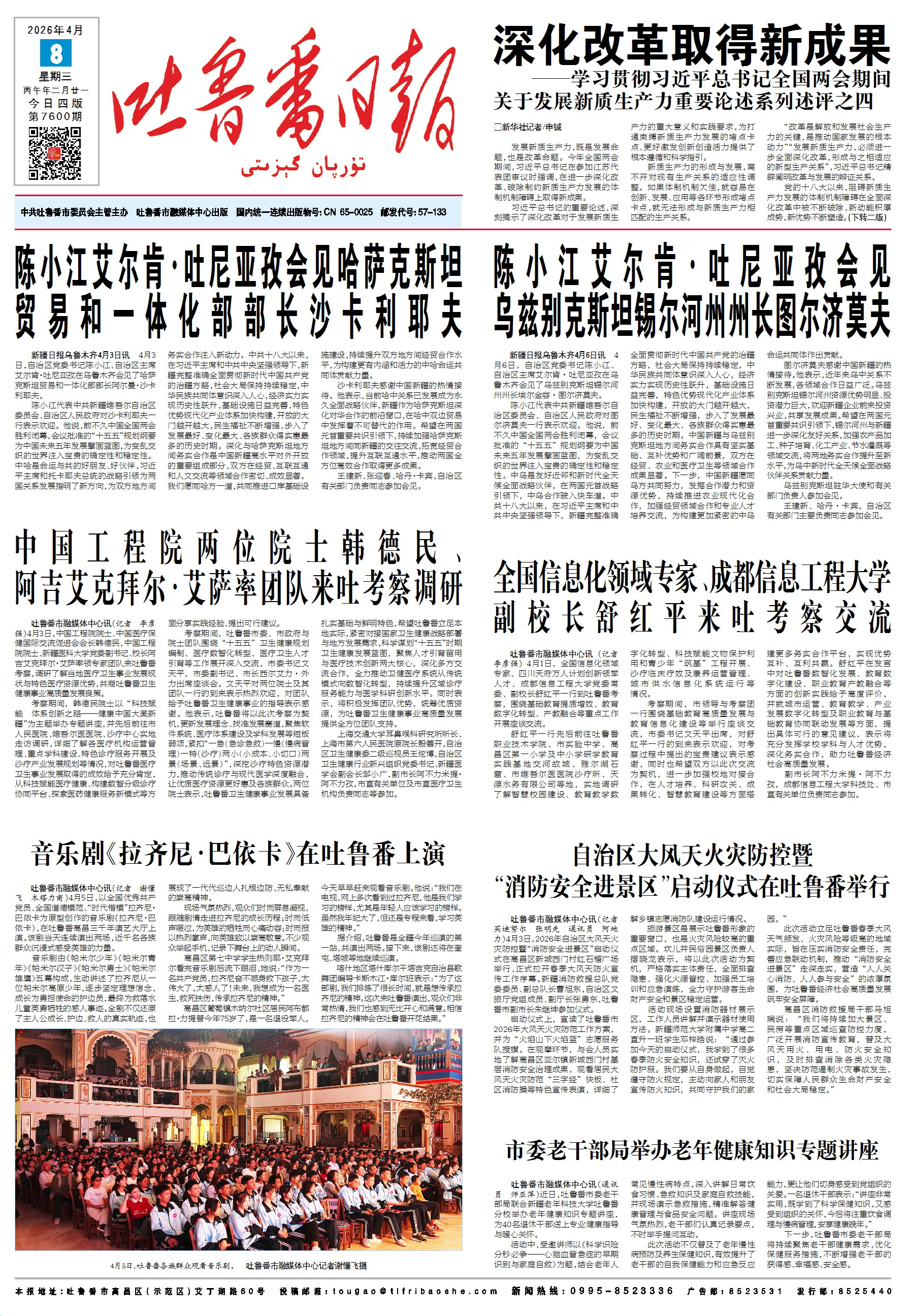 陈小江代表中共新疆维吾尔自治区委员会、自治区人民政府对图尔济莫夫一行表示欢迎。他说,前不久中国全国两会胜利闭幕,会议批准的“十五五”规划纲要为中国未来五年发展擘画蓝图,为变乱交织的世界注入宝贵的确定性和稳定性。中乌是友好近邻和新时代全天候全面战略伙伴,在两国元首战略引领下,中乌合作驶入快车道。中共十八大以来,在习近平主席和中共中央坚强领导下,新疆完整准确全面贯彻新时代中国共产党的治疆方略,社会大局保持持续稳定,中华民族共同体意识深入人心,经济实力实现历史性跃升,基础设施日益完善,特色优势现代化产业体系加快构建,开放的大门越开越大,民生福祉不断增强,步入了发展最好、变化最大、各族群众得实惠最多的历史时期。中国新疆与乌兹别克斯坦地方间务实合作具有坚实基础、互补优势和广阔前景,双方在经贸、农业和医疗卫生等领域合作成果显著。下一步,中国新疆愿同乌方共同努力,发掘合作潜力和资源优势,持续推进农业现代化合作,加强经贸领域合作和专业人才培养交流,为构建更加紧密的中乌命运共同体作出贡献。