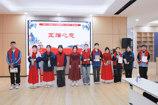 研学团学生与长沙市周南中学学生互赠礼物。